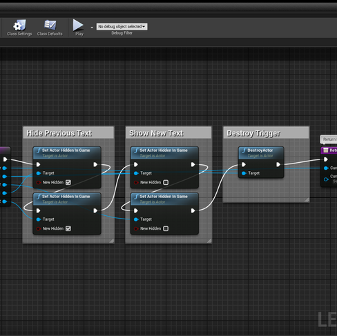 If I were to start this project over again. I would change the decision to work exclusively in the level blueprint. In all of my following level design projects, I rarely touch the level blueprint, and each element in the level is a separate blueprint. It's a much easier workflow for the long-term and makes changing and adapting specific objects or events way easier.