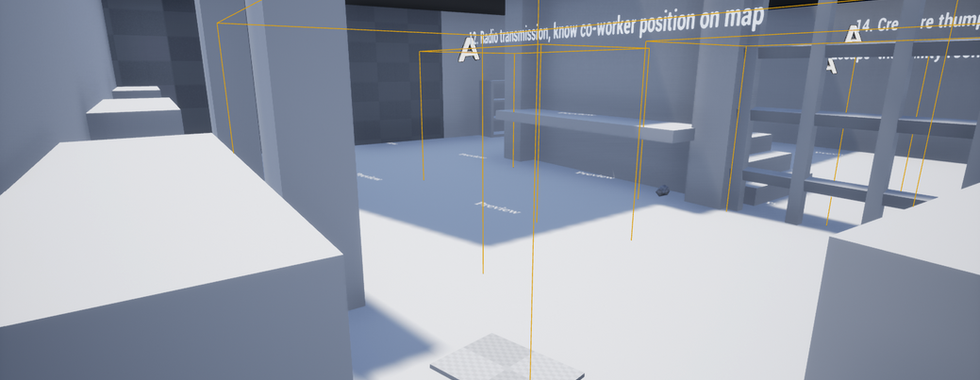 After blocking, my next objective was to start working on a popcorn trail that mirrored the steps written in my walkthrough. Each popcorn trail element needed a trigger box and a text renderer. I placed 15 popcorn events throughout the level. Each text render object described the event that triggered at that point in the game.