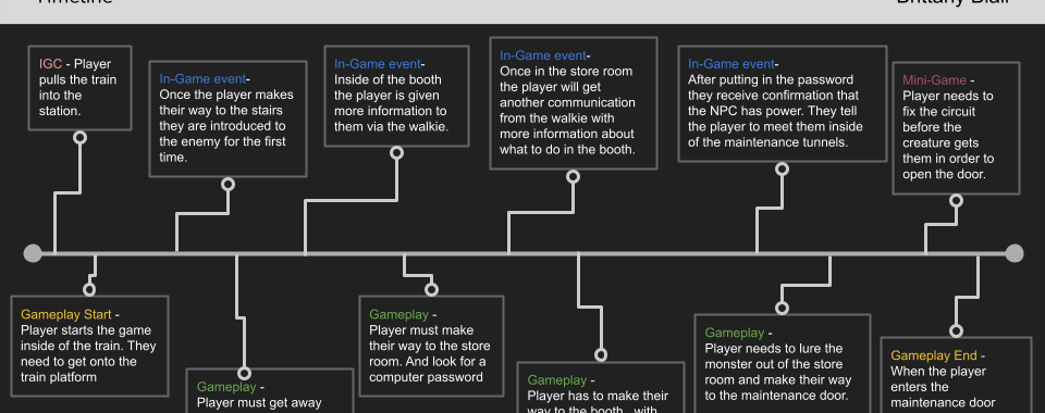 In the timeline document, I color-coded the different event types to visually organizing the flow. On the bottom of the timeline are all the gameplay events and above the line are cutscenes, In-game events, and puzzles.